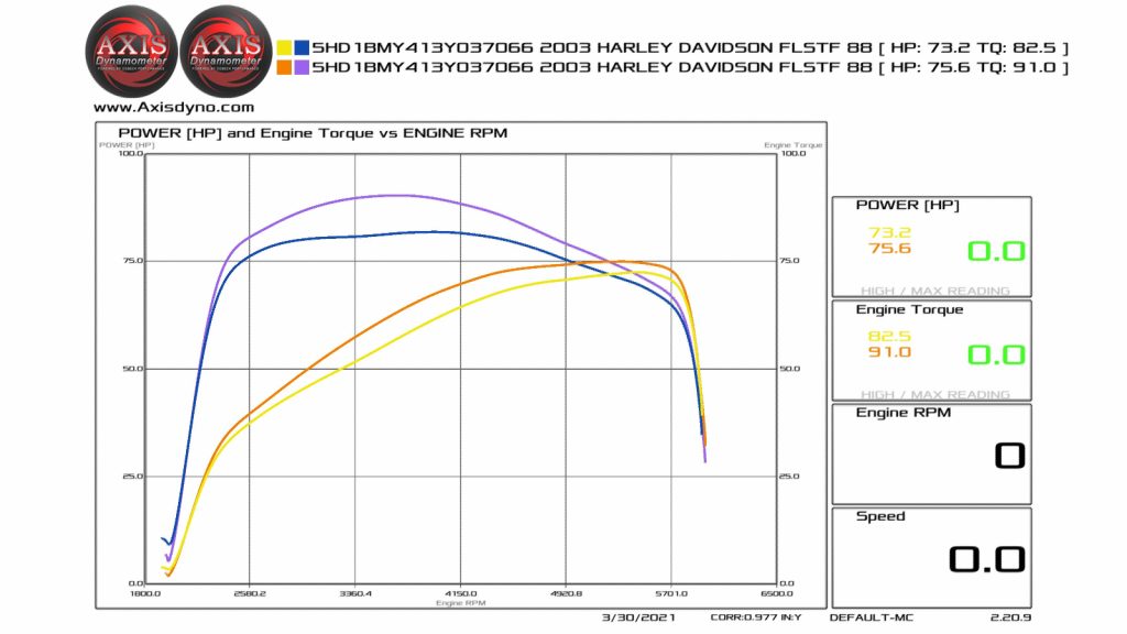 BACK TO DYNO CHARTS DYNO RESULTS This 2018 114ci Breakout received a significant upgrade to a 117ci with the Screamin’ Eagle Stage 4 Kit. We replaced the SE cam with a Feuling 521 Cam, added Rinehart Slip-On Mufflers, and enhanced airflow with an Arlen Ness Monster Sucker Air Cleaner. Finished with a Maximus Tuner. BIKE […]