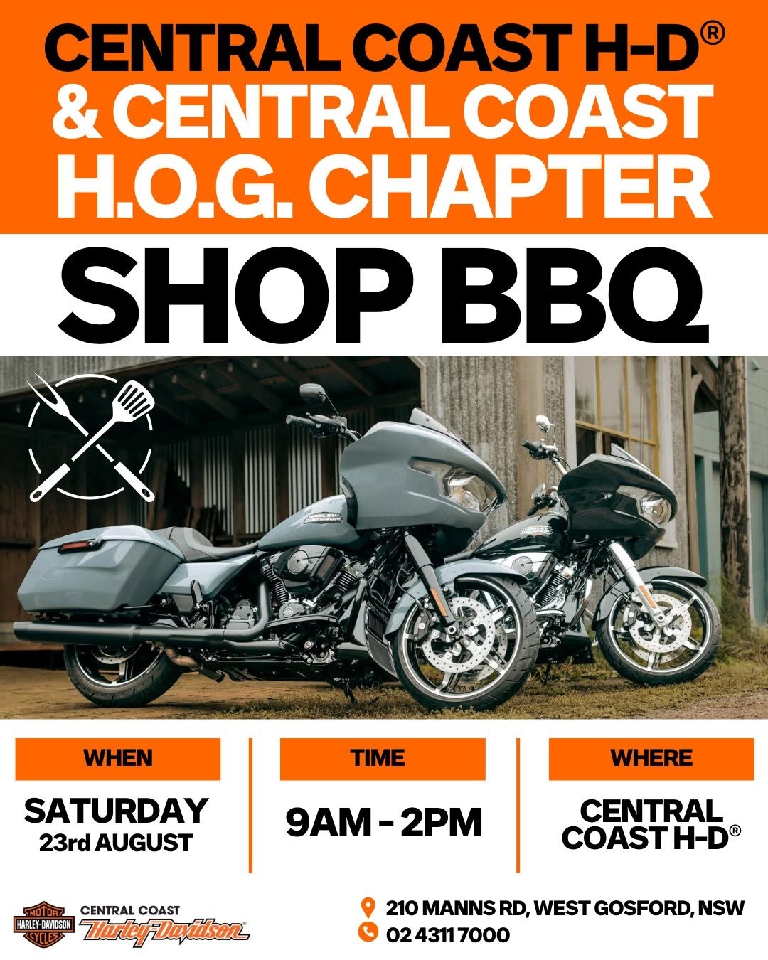 Central Coast H-D – Shop BBQ Central Coast H.O.G. Chapter is firing up the BBQ this SATURDAY at Central Coast H-D® 🌭🌭 Come down to check out: – Limited Release Harley-Davidson® Factory